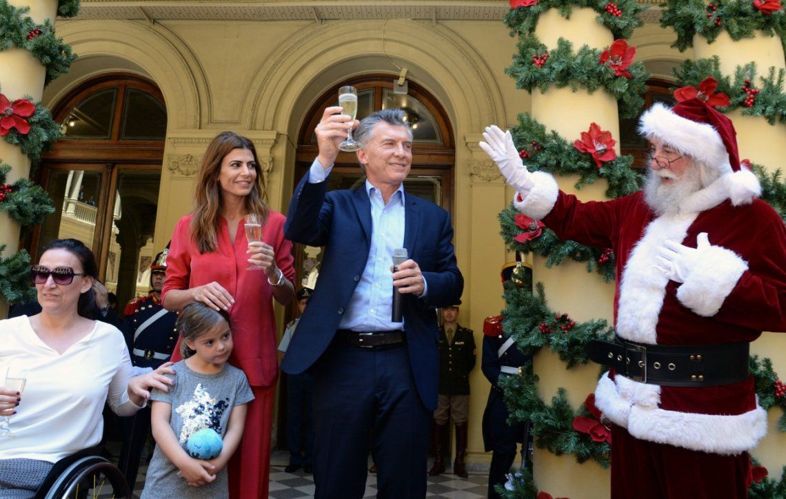 Pasado el mediodía Macri, rodeado de su mujer Juliana Awada, su hija Antonia y la vicepresidenta Gabriela Michetti, y un Papa Noel que transpiró más de la cuenta por la agobiante jornada, realizó el brindis navideño en Casa Rosada. Al alzar su copa frente a un Patio de las Palmeras colmado de empleados, el jefe de Estado recordó sus festejos navideños en Tandil cuando su abuela cocinaba pavo relleno y tortas para el postre. Y, al pasar, declaró que “hemos hecho mucho pero queda mucho más por hacer”.