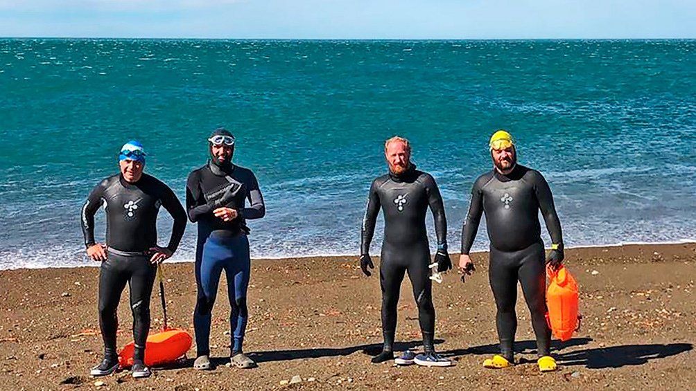 Julio Gaitán, Héctor Guittard, Pablo Pera y el entrenador del grupo Master del Celeste santacruceño, Alejandro Amuchástegui, iniciarán este sábado a las 8, en el Lago Argentino, la travesía planificada en cuatro etapas de 100 kilómetros diarios y un promedio de 10 horas por día de nado, hasta el 2 de marzo inclusive, con temperaturas de entre 7 y 9 grados por el origen glaciar de las aguas, hasta los 12 grados.