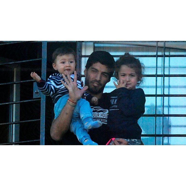 El futbolista uruguayo que fue expulsado del Mundial por propiciar un mordisco a un jugador italiano arribó a su hogar y junto a sus hijos salió a saludar al centenar de personas que se arrimaron a vitorearlo