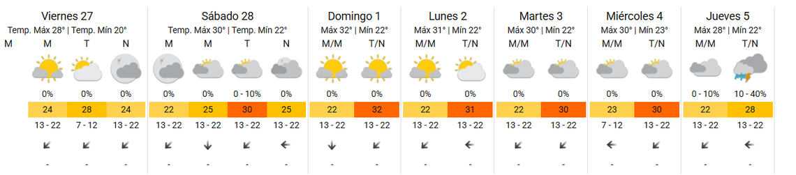 Ya el sábado, el panorama se mantendrá con cielo ligeramente nublado. Las marcas térmicas que oscilarán entre los 22°C y los 30°C, nuevamente con viento del sureste.