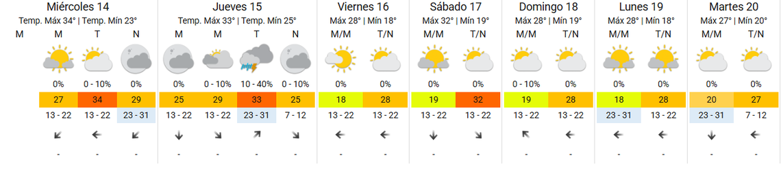 Ya el jueves, el panorama será de lluvias durante todo el día, con marcas térmicas que oscilarán entre los 23°C y los 30°C, nuevamente con viento del sureste.