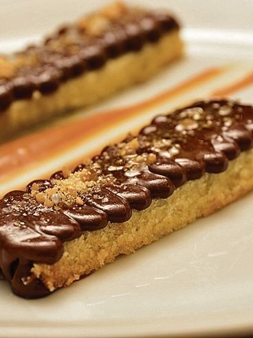 Armado del plato: cortar el biscuit en fetas una vez frío. Con una manga de pastelería, colocarle por arriba el cremoso de chocolate y, por encima, el crocante de almendras roto.