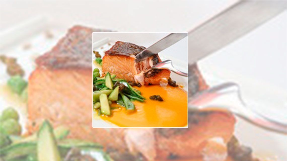 Preparación: para el salmón rosado con cítricos: sellar el salmón en una sartén y disponer en una placa. Llevar al horno a 200ºC por 10 minutos, aproximadamente. En una sartén, calentar aceite y saltear el ajo, verdeo, zucchini, chauchas y arvejas. Colocar la manteca y derretir. Retirar del fuego. Colocar el cremoso en una cazuela y calentar en el microondas por 90 segundos tapado con un folex. Retirarlo, revolver y verificar la temperatura. Si es necesario, calentar 30 segundos más. En un plato hondo de loza bien caliente, colocar en la base el cremoso, a un costado el salmón y la guarnición, en el otro costado. Volcar el fondo de cocción que queda en la sartén sobre el salmón y rociar la guarnición con las alcaparras fritas.