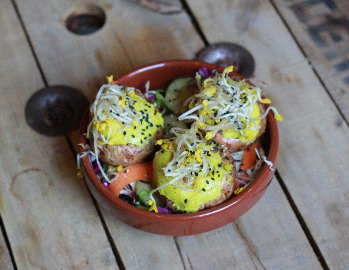 En esta nota, la cocinera nos comparte tres recetas veganas que forman parte de la carta del restaurante y que, más allá de la ideología de cada uno, están destinadas a todas las personas curiosas -veganas o no- que busquen alimentarse mejor y con mayor consciencia. Los hongos Portobello con crema de castañas son una preparación crudivegana. “Dentro del veganismo, hay distintas ramas, y una de ellas es el crudiveganismo. El crudivegano se alimenta a base de vegetales crudos. En esta receta, la base de la crema son las castañas de Cajú, fruta seca que contiene un alto contenido de aminoácidos”, explica Macarena. Puede ser una entrada original o un plato principal si se lo acompaña con una ensalada.