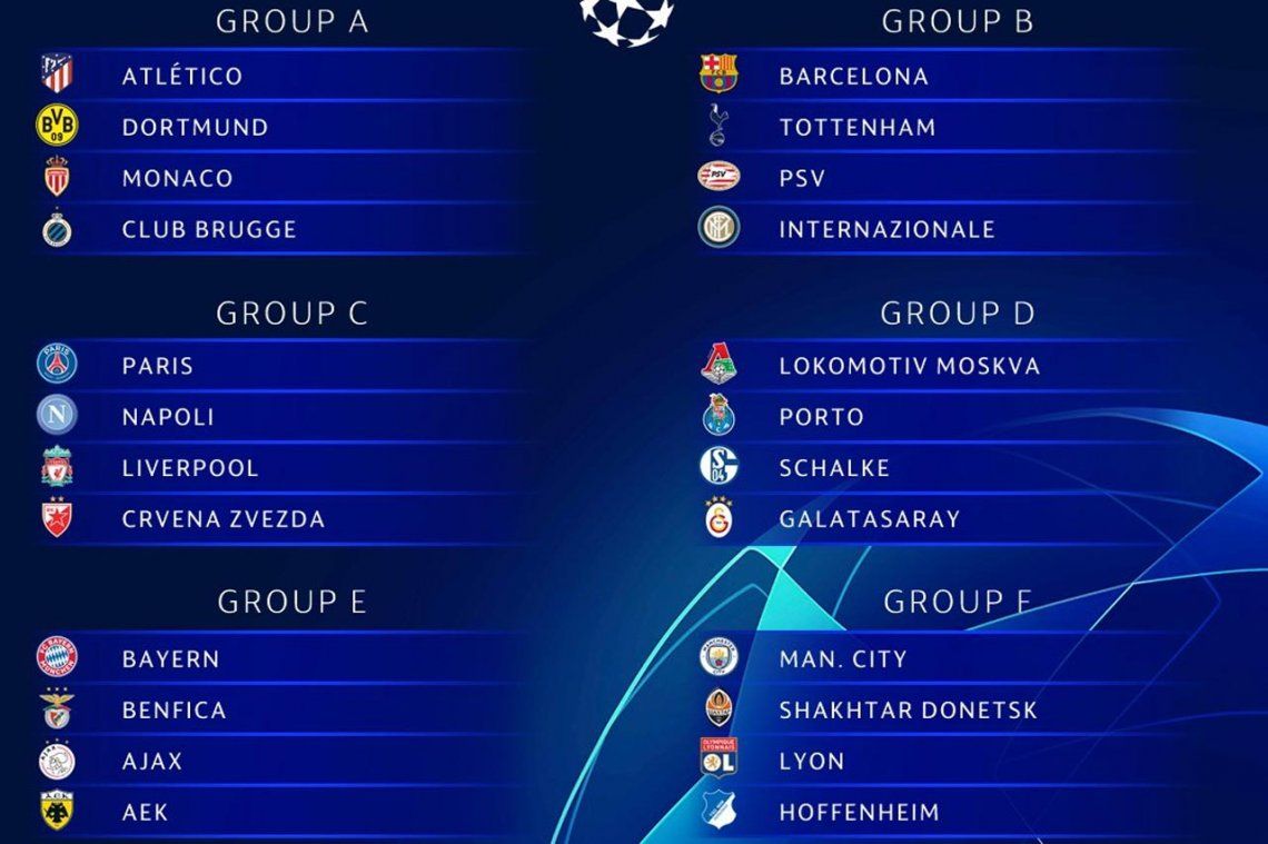 - GRUPO A: Atlético de Madrid (ESP), Borussia Dortmund (ALE), Mónaco (FRA) y Brujas (BEL).