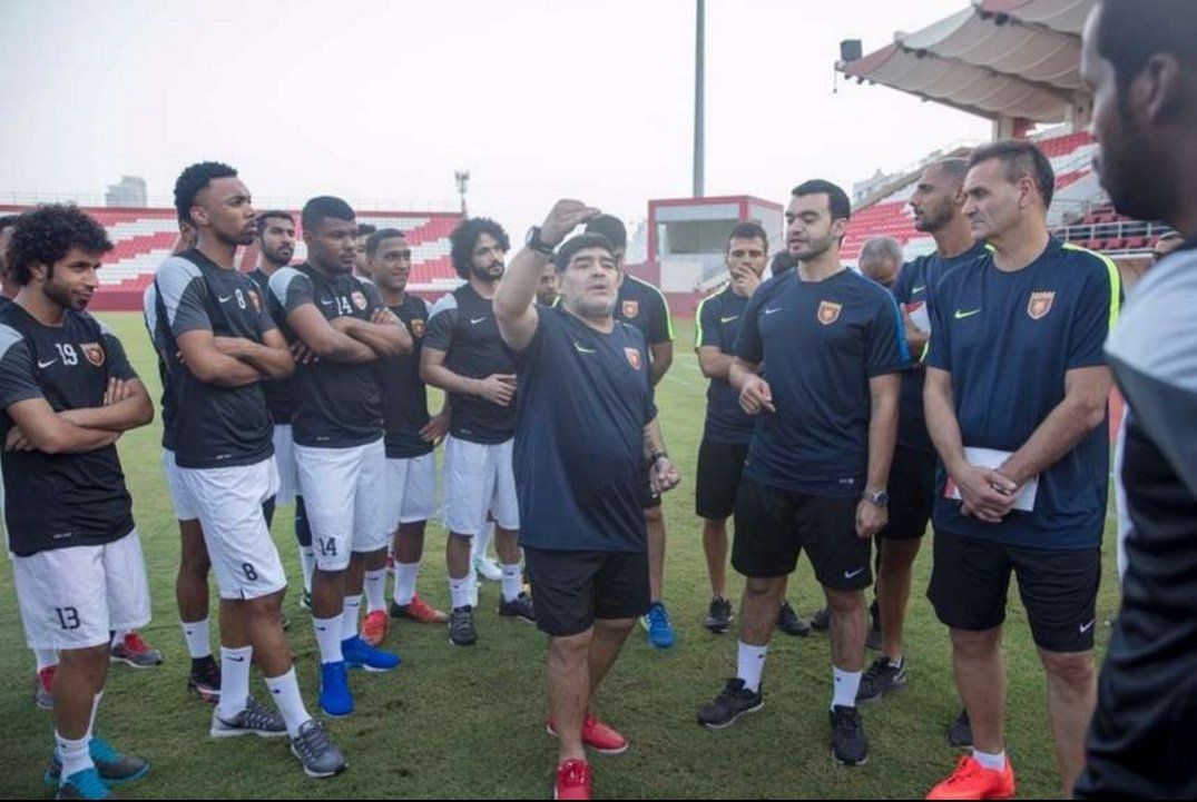 Diego Armando Maradona comenzó una nueva experiencia en los Emiratos Árabes. El Diez volvió a lo que más le gusta, la dirección técnica, y este sábado dirigió la primera práctica con el Al Fujairah, club con el que firmó por un año.