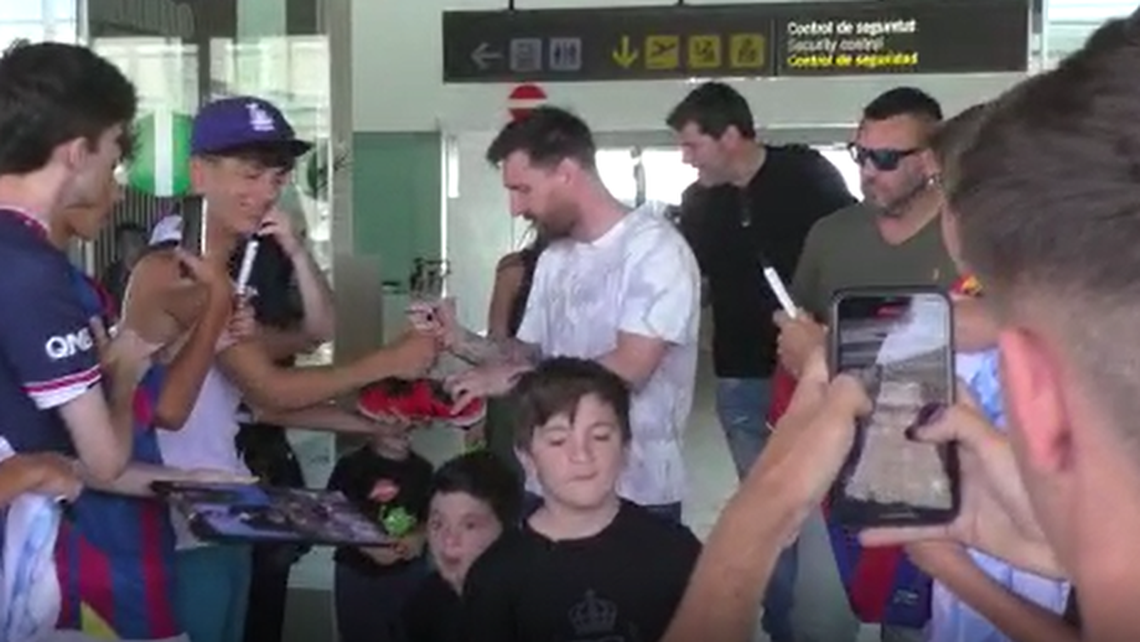 Ya en su salida del aeropuerto, Messi fue frenado por un grupo de fanáticos que le pidió fotos y autógrafos en fotos, camisetas, banderas y todo lo que había a mano.