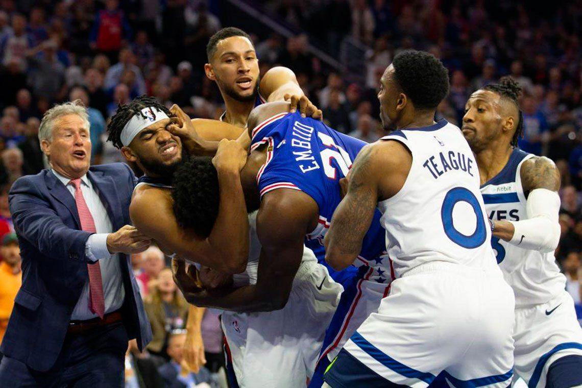 La NBA se transformó por un rato en una lucha de catch. ¿Qué pasó? De todo: en el partido de Philadelphia- Minnesota, que finalizó 117-95 a favor de los locales, los grandotes Karl-Anthony Towns y Joel Embiid se trenzaron en el tercer cuarto, y se metieron absolutamente todos para separarlos.