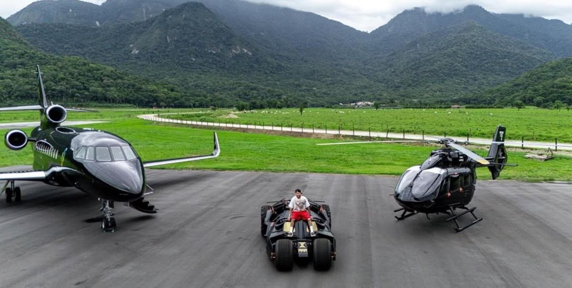 El futbolista brasileño presentó una réplica del Batimóvil construida a medida, junto a su jet y helicóptero. El auto no puede circular y es una pieza de colección valuada en millones.