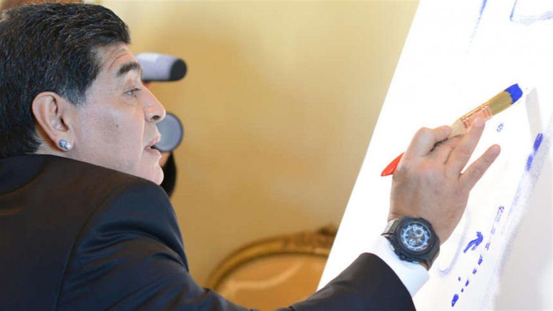 El Diez fue invitado a un evento en el que, con un pincel, plasmó en un lienzo en blanco el tanto con el que hizo historia.