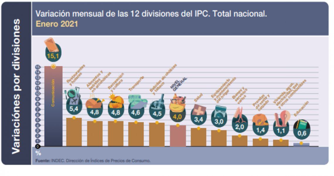 Debajo del 4% general se ubicaron Salud (3,4%), Equipamiento y mantenimiento del hogar (3%), Bienes y servicios varios (2%), Prendas de vestir y calzado (1,4%), Vivienda, agua, electricidad, gas y otros combustibles (1,1%), por el aumento de las expensas a raíz del bono a los encargados de edificios de diciembre, y Educación (0,6%).