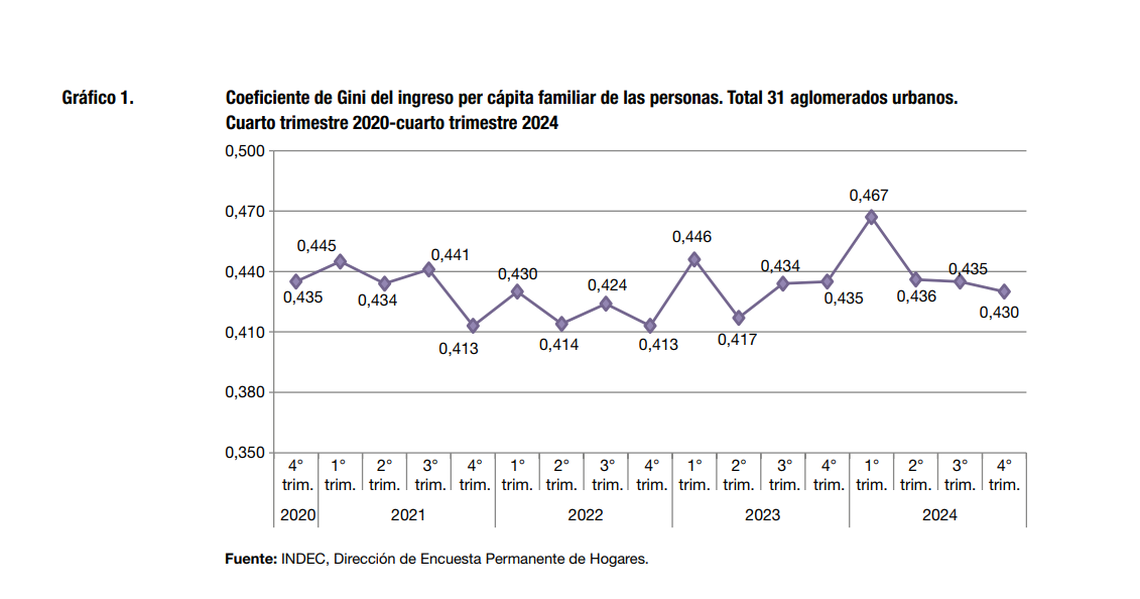 Otro dato no menor es que la distribución del Ingreso mejoró respecto al año pasado. . El Indec dio cuenta del Coeficiente de Gini, que tiene a “0” como mayor nivel de equidad, y “1” el de desigualdad. A finales del año pasado alcanzaba a 0,430 puntos, contra el 0,435 de octubre-diciembre del 2024.