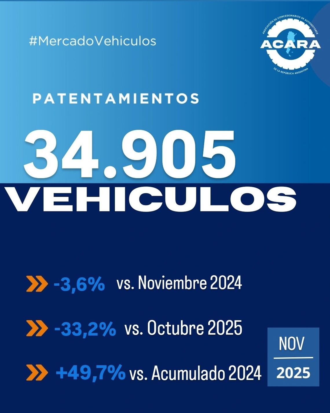 Según la Asociación de Concesionarios de Automotores de la República Argentina (ACARA), se patentaron 34.905 unidades, lo que representa una caída del 3,6% interanual y un desplome del 33,2% respecto a octubre, cuando se habían comercializado casi 52.000 vehículos.