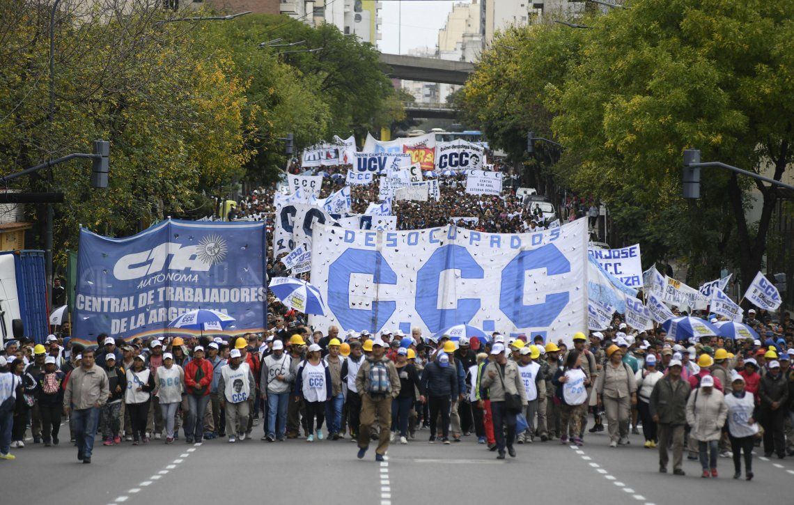 Los movimientos sociales denominados "Los Cayetanos" -que integran la Corriente Clasista y Combativa (CCC), Barrios de Pie y la Confederación de Trabajadores de la Economía Popular (CTEP)- marchan desde Constitución hasta el monumento Canto al Trabajo.