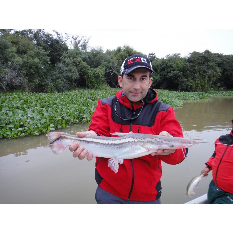 “Antes de que caiga el sol salimos a la boca de un arroyo que daba al Paraná y nos dedicamos a pescar los pico pato con morenitas como carnada. Usamos leader de 30 lbs y anzuelo 6/0, pasando un plomito de 15 gramos en formato redondo o aceituna por el multi. Lo divertido de esta pesca es que la practicamos con equipos muy livianos y el pez ofrece una lucha bravísima. El pique es super potente, con tres cabezazos y una corrida. El pico pato, que allá le llaman manduví, busca siempre la profundidad, es como un surubí pero en tamaño que rara vez pasa los 2 kilos”, señala Poppers.