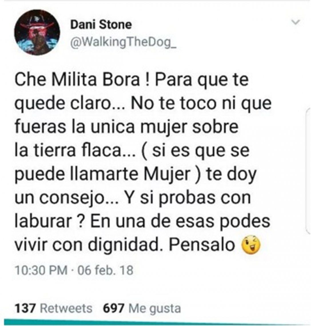 Al enterarse de este rumor, y sabiendas que fue difundido por la rubia, el ex de Jimena Barón se volvió a colocar los botines y salió con los tapones de punta. "¡Che Militta Bora! Para que te quede claro… No te toco ni que fueras la única mujer sobre la tierra flaca… (si es que se puede llamarte Mujer) Te doy un consejo… ¿Y si probas con laburar? En una de esas, podés vivir con dignidad. Pensalo", escribió Osvaldo con sus 280 caracteres.