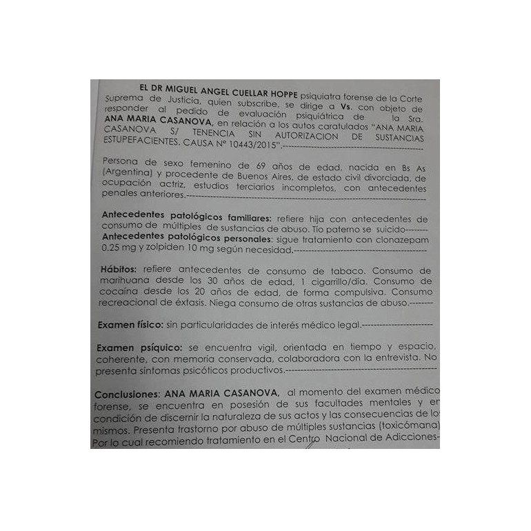 Por último el informe del médico psiquiatra deja expresa constancia que la diva presenta alteraciones por ese consumo de sustancias y le recomienda un tratamiento para poder recuperarse. "Está en condiciones de discernir la naturaleza de sus actos y las consecuencias de los mismos. Presenta trastorno por abuso de múltiples sustancias por lo cual recomiendo tratamiento en el Centro Nacional de Adicciones".