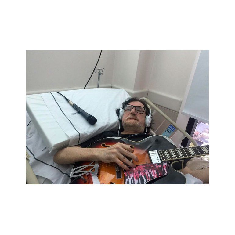 Con una notebook, algunos cables y el televisor de la sala de internación, Charly se sentó a tocar su guitarra y teclado frente a imágenes del fallecido músico mientras sonaba "Rasguña las piedras", de Sui Generis, en una versión en vivo juntos del año 2.000.
