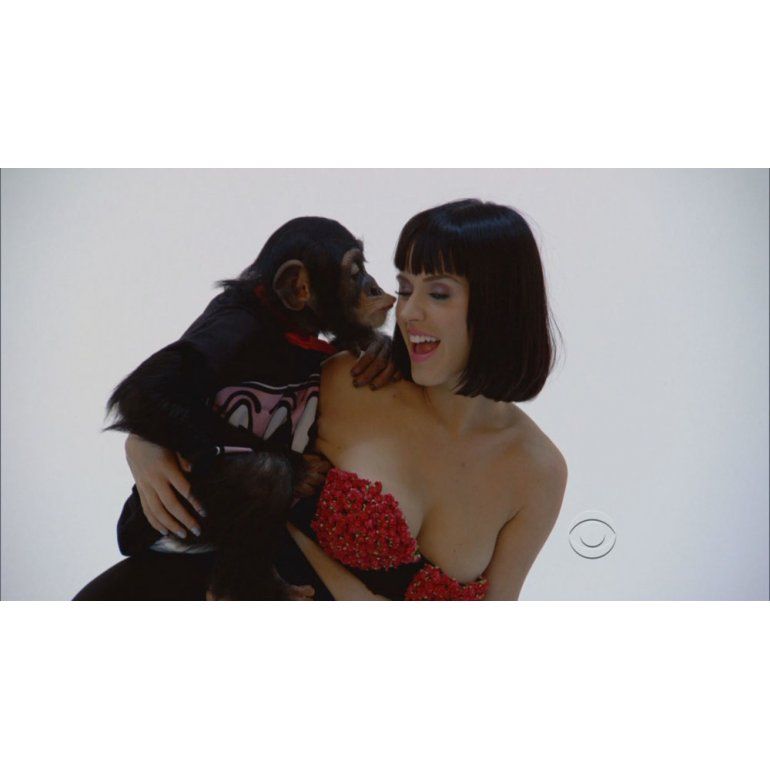 En la sesión posó cariñosamente con un chimpance, el cual ante la bella y exultante mujer que tenía al lado no dudó en tocarle un seno y hasta robarle un beso.