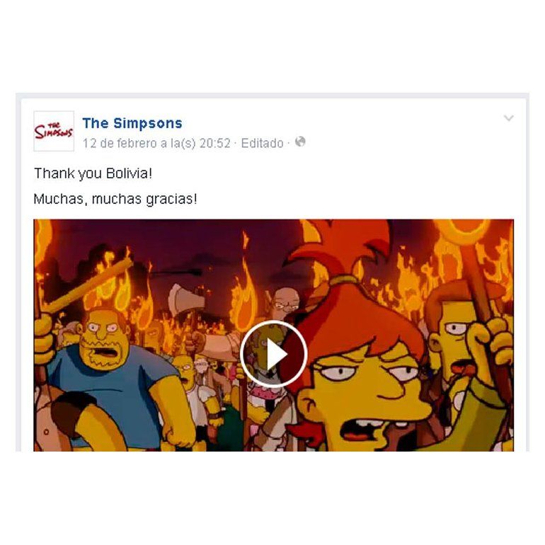'Thank you, Bolivia! Muchas, muchas gracias!', reza el mensaje, que va acompañado de un video, extraído de la película de Los Simpson, y que muestra a los personajes de la famosa serie con antorchas en la mano, editado junto con el de la marcha de fanáticos bolivianos disfrazados que varios medios alrededor del mundo dieron a conocer en los últimos días.