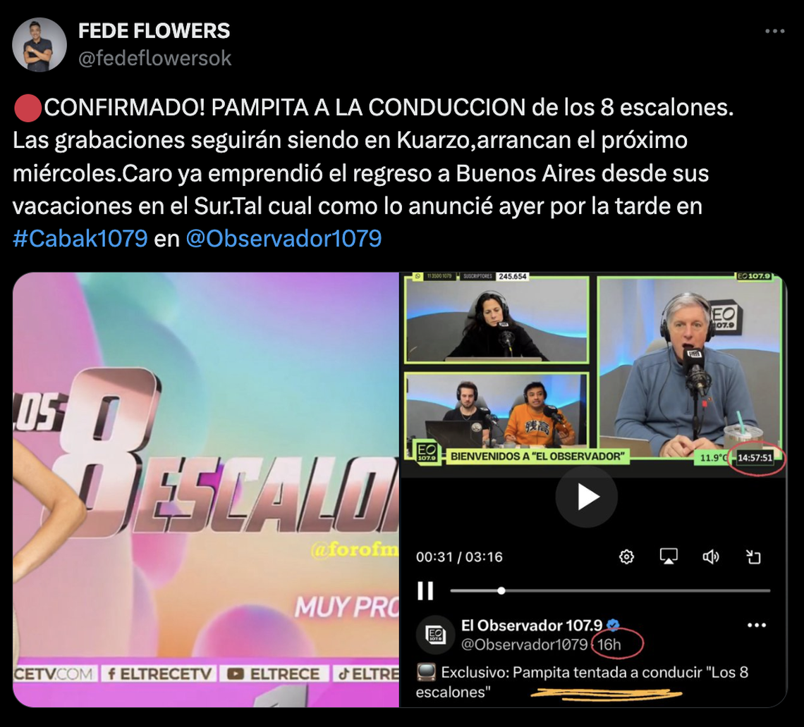 “CONFIRMADO! PAMPITA A LA CONDUCCIÓN de los 8 escalones. Las grabaciones seguirán siendo en Kuarzo, arrancan el próximo miércoles. Caro ya emprendió el regreso a Buenos Aires desde sus vacaciones en el Sur” escribió el periodista en la red social "X".