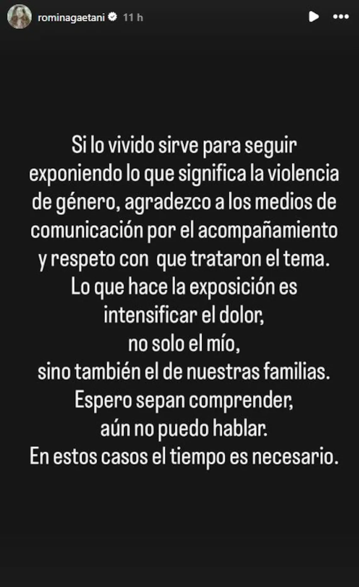 Terminando el mensaje contó su calvario en los últimos años “Lo que hace la exposición es intensificar el dolor, no solo el mío, sino también el de nuestras familias. Espero sepan comprender, aún no puedo hablar. En estos casos el tiempo es necesario”.