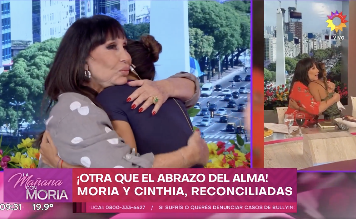 Después de unas semanas tormentosas, donde quedaron en el ojo de la polémica, Moria Casán y Cinthia Fernández recrearon ante las cámaras del programa "La Mañana con Moria" la reconciliación que tuvieron el día anterior, dándose las disculpas públicas frente a toda su audiencia.