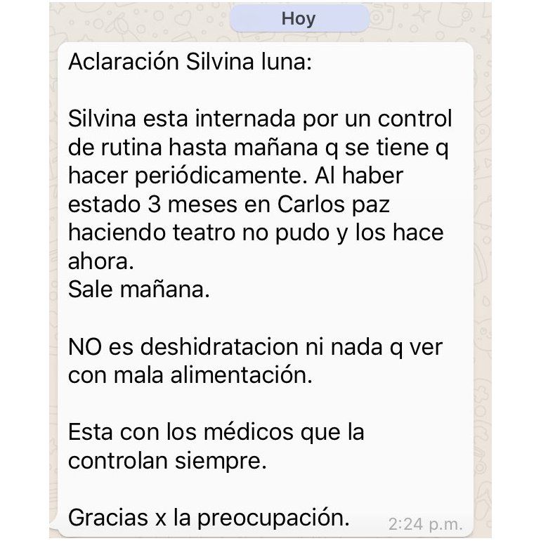 "Silvina está internada por un control de rutina que se tiene que hacer periódicamente y estará internada hasta mañana. Al haber estado tres meses en Carlos Paz haciendo teatro no pudo y por eso se los hace ahora. Sale mañana. NO es deshidratación ni nada que ver con la mala alimentación. Está con los médicos que la controlan siempre", dice el comunicado. La internación fue programada y Silvina está bien, una buena noticia para la rosarina.
