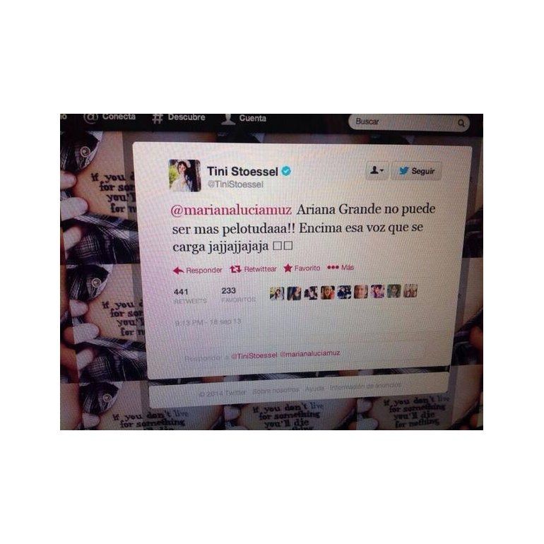 Sin embargo, a la joven Stoessel, de tanto en tanto, se le atribuyen arrebatos verbales contra sus pares. Ya habrían sufrido sus embates Selena Gomez y Demi Lovato y ahora la nueva destinataria habría sido la estadounidense Ariana Grande, la protagonista de la popular sitcom juvenil Sam & Cat que emite Nickelodeon.