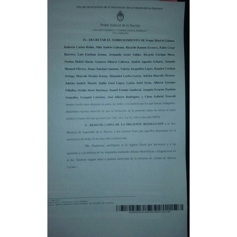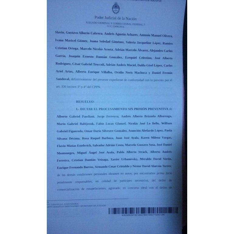 La mayoría de los prefectos procesados pertenecen a la División Narcotráfico. Casanello dictó los 26 procesamientos y en todos los casos fue sin prisión preventiva. El juez los considera "partícipes necesarios" del delito de comercialización de estupefacientes agravado, coautores del delito de abandono de personas (seguido de muerte y de grave daño en la salud) y coautores del delito de incumplimiento de los deberes de funcionario público.