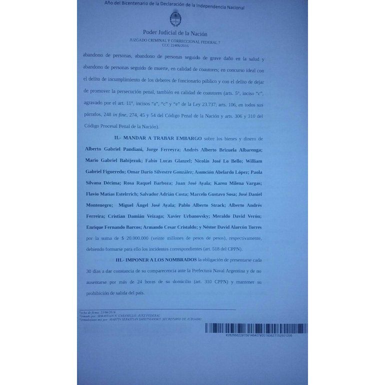 Por otra parte Casanello también dispuso embargos solidarios por 20.000.000 de pesos "a los fines de garantizar, entre otras cosas, eventuales indemnizaciones a las víctimas", y envió copia de la resolución al Ministerio de Seguridad de la Nación. Esta resolución sigue el hilo de dos pronunciamientos anteriores, a través de los cuales el juez procesó a los empresarios encargados de la organización y a los funcionarios del gobierno porteño que tenían a cargo el control de la fiesta.