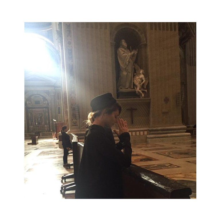 Fiel a su estilo, la Griega contó casi el minuto a minuto de lo que vivió en Roma a través de su cuenta en lña red social del pajarito. Primero mostró el atuendo que eligió para la ocasión, después de las críticas que recibió cuando intentó conocerlo meses antes con una remera musculosa sin corpiño. Esta vez se fue directamente para el otro lado y se compró un vestido negro que le cubría desde el cuello hasta los pies. Zapatos negros y un sombrero al tono no dejaban ver nada de su piel más allá de su rostro. "Vestuario y entrada", escribió.