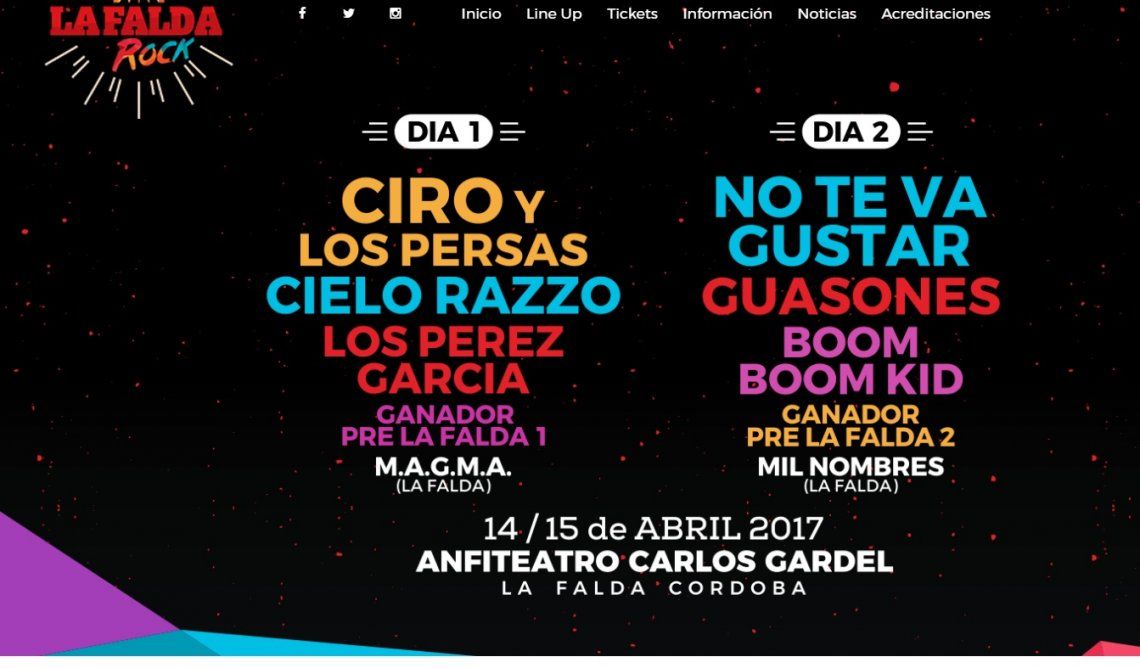 Sin dudas que el Festival de Rock por excelencia en el Interior del país es el de La Falda. En Córdoba fue esa ciudad turística la que dio el puntapié inicial en este tipo de eventos en el Interior y con el correr de los años se hizo tan importante que por sus escenarios supieron tocar bandas como Seru Giran, Soda Stereo, Virus, Git, Zas, entre otros. La historia de este emblemático festival data desde 1980 cuando fué la primera edición que se hizo y que siguió de manera consecutiva hasta 1987 y que tuvo su última edición en 1992. Ahora, 25 años después, se decidió hacer una nueva edición que se llevará a cabo en Semana Santa y que promete estará a la altura de su historia. El anfiteatro Carlos Gardel será el escenario y la grilla contiene casi la programación completa esperando que se sumen grandes sorpresas en los últimos meses. Confirmados No te Va Gustar, Cielo Razzo, Boom Boom Kid y Los Pérez García para las dos fechas 14 y 15 de abril. Semana Santa en La Falda.