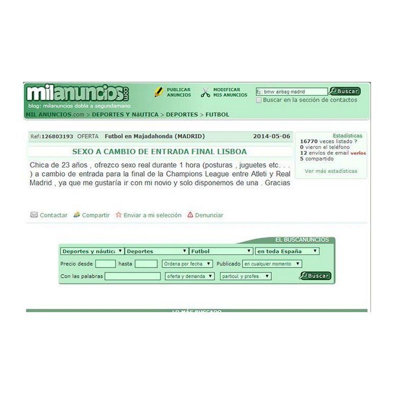 El hecho ocurrió en España, donde la joven de 23 años publicó en una página de anuncios: "Ofrezco sexo real durante 1 hora (posturas, juguetes etc...) a cambio de una entrada para la final de la Champions League entre Atleti y Real Madrid, ya que me gustaría ir con mi novio y solo disponemos de una. Gracias".