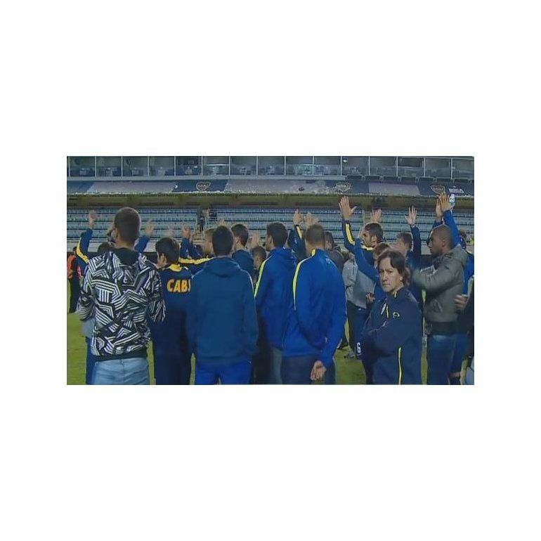 Una cámara captó el momento en que el arquero de Boca arenga el saludo y varios lo siguen. Daniel Osvaldo y Juan Manuel Martínez se negaron.