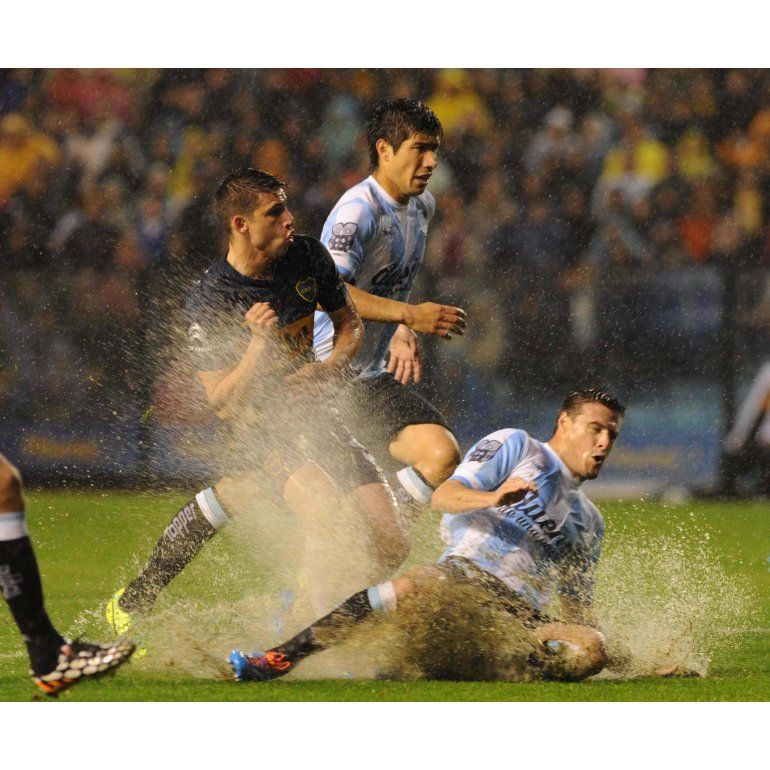 Federico Beligoy, árbitro del encuentro, resolvió interrumpir el encuentro a los 14 minutos del segundo tiempo, cuando hacía rato que el campo de juego se parecía a una piscina e imposibilitaba que la pelota circulara con normalidad. Un rato antes, a los 25 de la etapa inicial, Jonathan Calleri había puesto en ventaja a Boca con un derechazo cruzado tras una jugada que él mismo inició con un quite sobre el borde del área, lleno de piernas que levantaban barro y charcos de agua. Hasta entonces, Boca justificaba su ventaja a partir del oportunismo y una mayor inteligencia que su rival para afrontar las condiciones del partido. El "Xeneize" se encaminaba a su tercer triunfo al hilo en el campeonato de Primera División, mientras que Racing prolongaba su crítico presente con la tercera derrota al hilo. -Síntesis- Boca Juniors: Agustín Orión; Leandro Marín, Mariano Echeverría, Daniel Díaz y Nicolás Colazo; Cristian Erbes, Fernando Gago y Marcelo Meli; Federico Carrizo, Jonathan Calleri y Andrés Chávez. DT: Rodolfo Arruabarrena. Racing Club: Sebastián Saja; Iván Pillud, Luciano Lollo, Yonathan Cabral y Leandro Grimi; Gastón Díaz, Ezequiel Videla, Luciano Aued y Marcos Acuña; Gonzalo Castillón y Gustavo Bou. DT: Diego Cocca. Gol en el primer tiempo: 25m. Jonathan Calleri (BJ) Amonestados: Erbes (BJ); Díaz (RC) Incidencia: en el segundo tiempo, a los 12m. el árbitro Federico Beligoy suspendió el partido por inclemencias climáticas. Arbitro: Federico Beligoy Cancha: Boca Juniors.