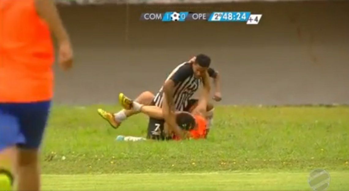 Se trata de Jeferson Reis, jugador de Operario, quien no se bancó la alegría de Tadeu Francisco, jugador de 19 años de las inferiores de Comercial, lo tiró al piso, se le subió encima y le arrojó un golpe tras otro, hasta que algunos jugadores, y los miembros del cuerpo técnico del Operario lo detuvieron.