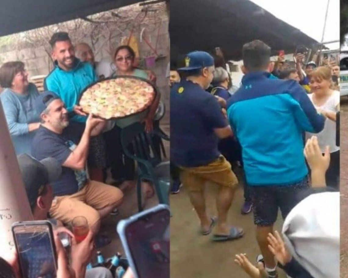 Tevez visitó a la familia de un amigo y aprovechó para compartir un momento agradable con la gente que se acercó a saludarlo. Mediante los videos que publicaron los hinchas en las redes sociales, se lo pudo ver compartiendo empanadas, pizzas y hasta bailando.