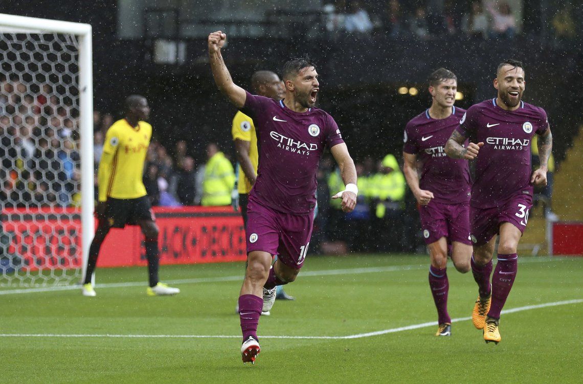 Sergio “Kun” Agüero se despachó este sábado con un triplete y su compatriota Nicolás Otamendi con otro tanto, en la goleada del Manchester City sobre Watford por 6-0, de visitante, que le permitió seguir en la punta de la Liga inglesa de fútbol al promediar la quinta fecha.