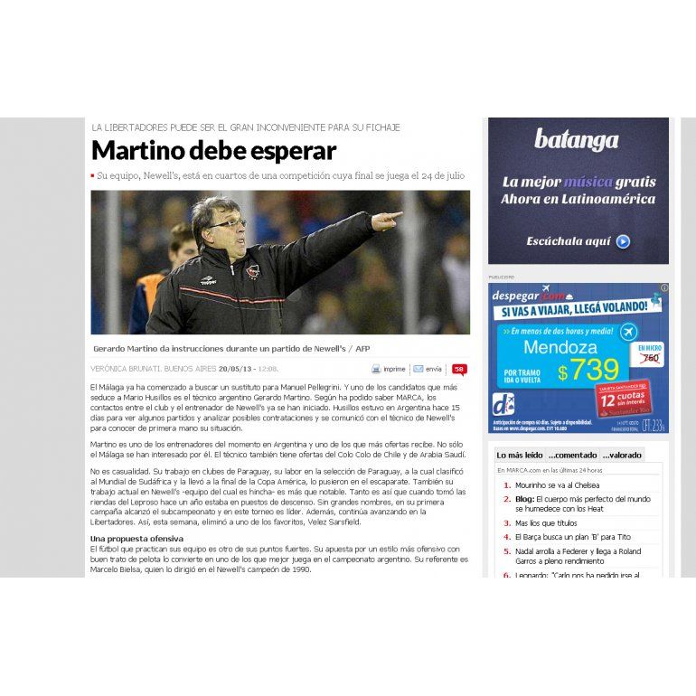 Sin embargo, existe una traba vinculada a los tiempos: Martino ya anunció que a pese a que su vínculo finaliza en junio, continuará si Newell's sigue adelante en la Copa Libertadores. Y la final está prevista para el 17 (ida) y 24 de julio (revancha), lo cual se contrapone con las fechas del Málaga, que por entonces debería estar concluyendo la pretemporada.