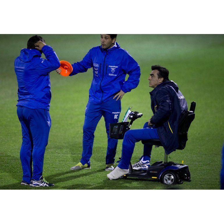 Gustavo Quinteros, quien tiene colocada una protección en la pierna izquierda, ya dirigió algunos entrenamientos a bordo de este vehículo que funciona con baterías y tiene un volante, parecido al de una bicicleta, y que además consta de tres ruedas y una canasta para guardar objetos en la parte frontal.