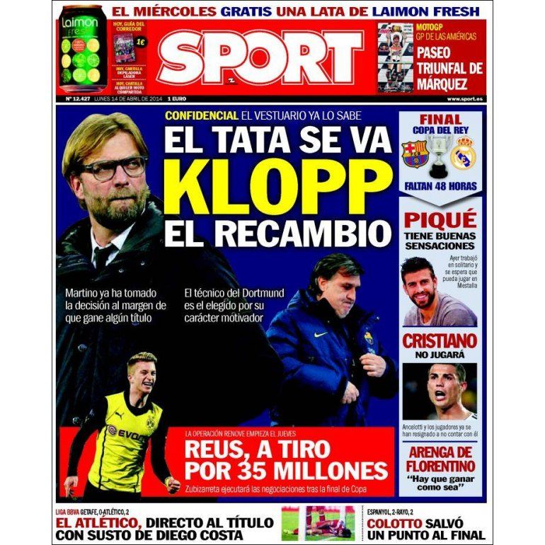 El diario Sport tituló en su tapa, con grandes caracteres "Confidencial. El vestuario ya lo sabe. El 'Tata' se va. Klopp el recambio", y aclaró que "Martino ya ha tomado la decisión, al margen de que gane algún título".