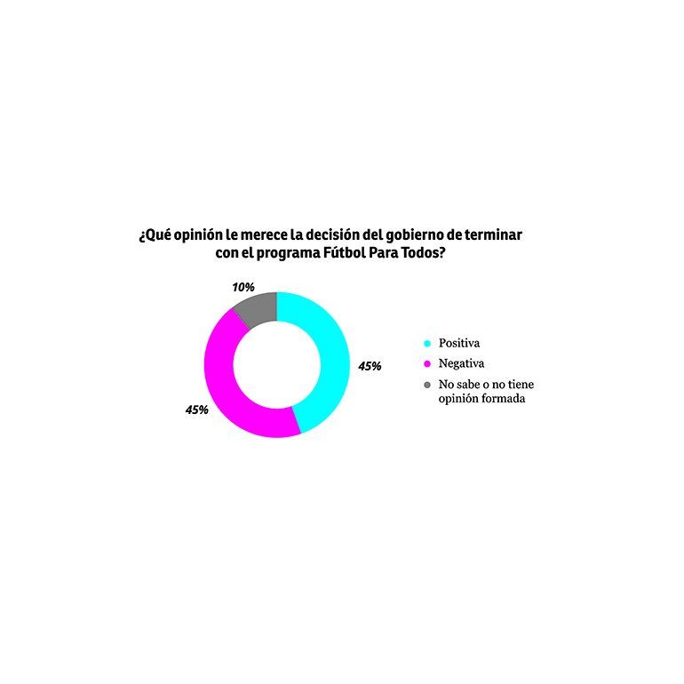 El final del programa Fútbol Para Todos divide la postura de los argentinos en idénticas proporciones. Así lo refleja una encuesta exclusiva de DIARIO POPULAR, realizada por la consultora Opina Argentina, cuyos datos indican que un 45% de los entrevistados está de acuerdo con que el gobierno nacional cierre su vínculo con la AFA para la televisación de los partidos y otro 45% piensa en forma negativa al respecto, con un 10% que no sabe o no contesta acerca del tema.