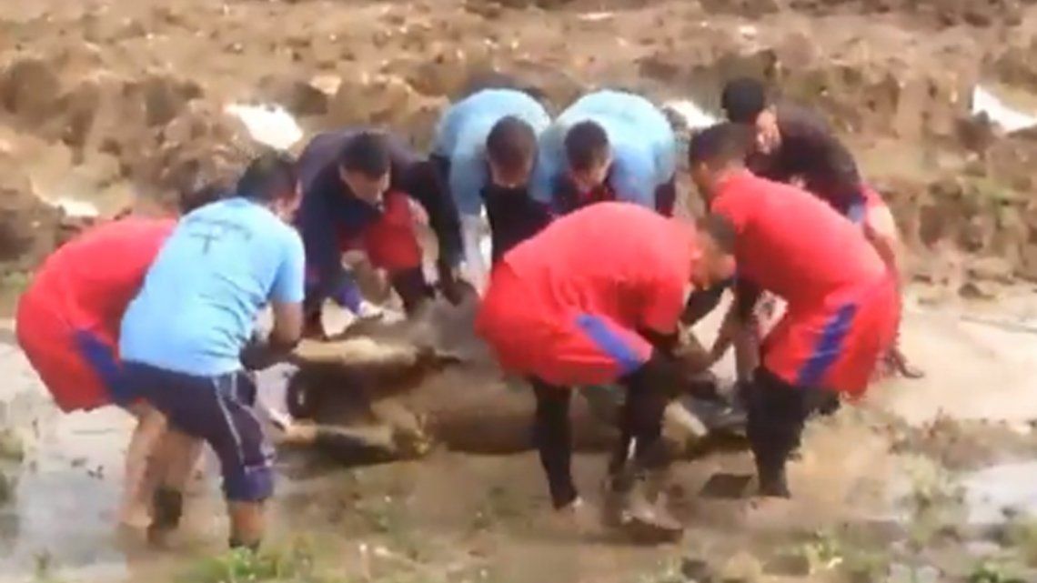 Vestidos y listos para salir a la cancha, el grupo vio como una vaca que estaba cerca de la cancha se había atorado en el barro y que estaba moribunda.