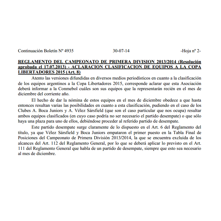 Aunque el ítem citado remarca que queda excluido el primer puesto, Baldomar hacía la hincapié de todos modos porque la tabla en cuestión no es la de un torneo, sino que comparten le primera colocación en la suma de las temporadas que se tienen en cuenta para clasificar al máximo torneo continental. En la última reunión de Comité Ejecutivo que presidió Julio Grondona se ratificó el sistema de desempate entre Vélez y Boca, que hoy cobra valor.