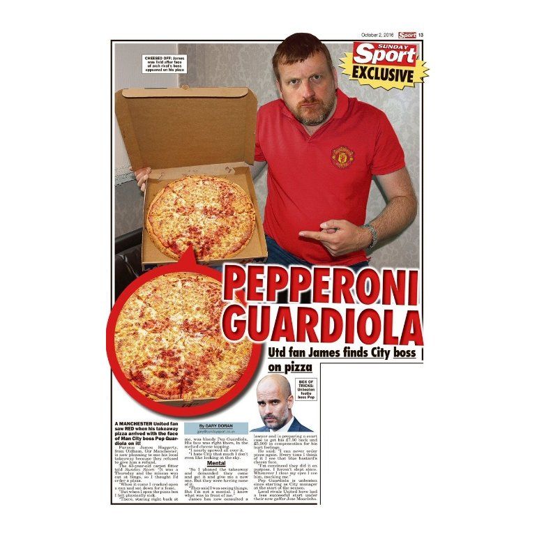 Un hincha de Manchester United se enfureció con una pizzería al encontrar en su pedido la cara de Pep Guardiola, el entrenador del City, el máximo rival, y exige una compensación por "haber herido sus sentimientos".
