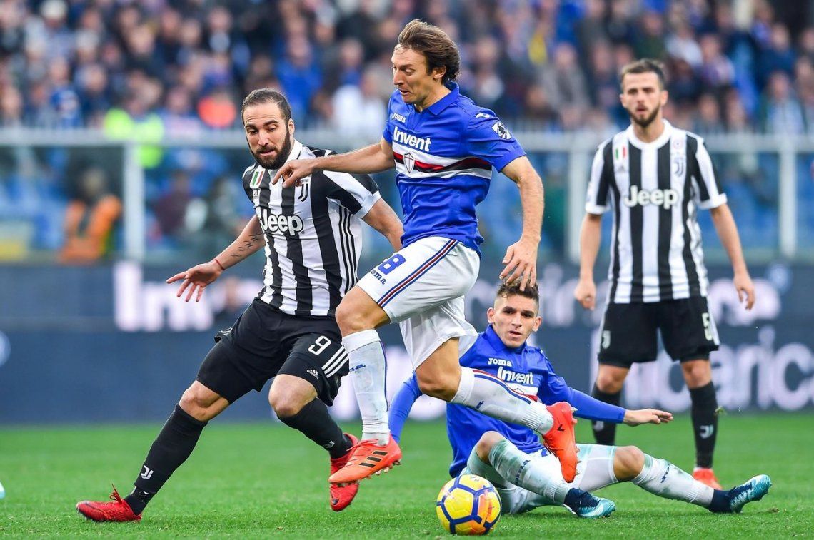 El vigente hexacampeón del fútbol italiano, Juventus, se alejó este domingo a cuatro unidades de la punta de la Serie A, al perder en su visita a Sampdoria 3 a 2 pese a la reacción que mostró en el final con los goles de los argentinos Gonzalo Higuaín y Paulo Dybala.