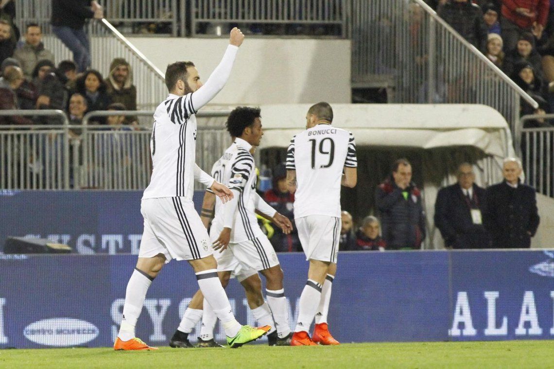 Dos nuevos goles de Gonzalo Higuaín dieron a Juventus un valioso triunfo 2-0 en campo de Cagliari para seguir como firme líder de la Liga de fútbol de Italia.