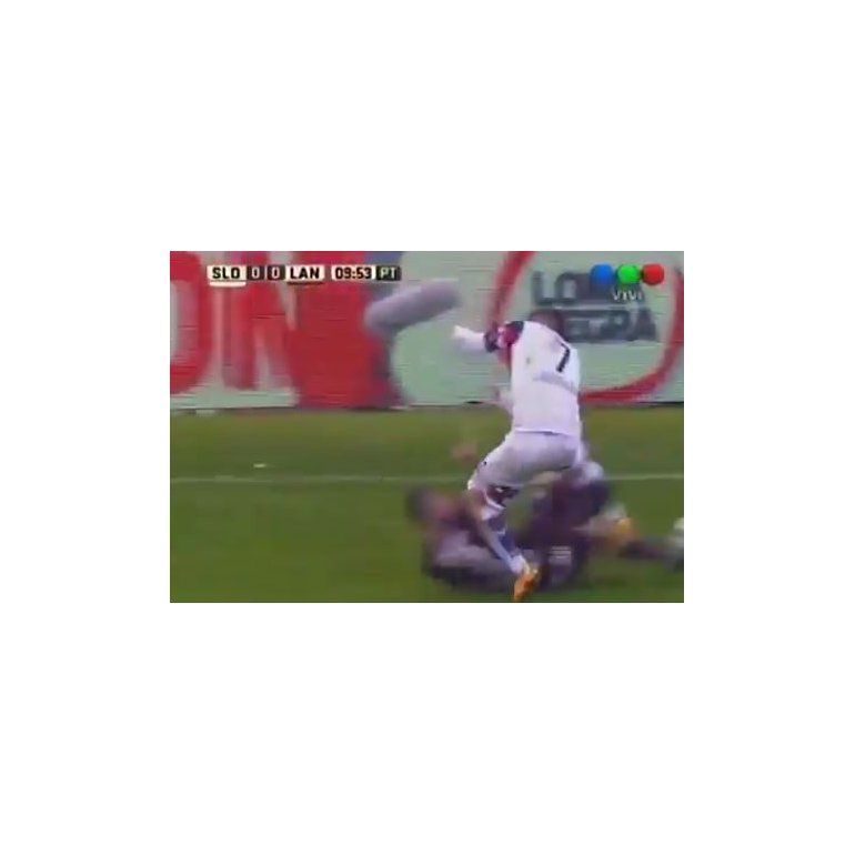 Julio Buffarini, lateral derecho de San Lorenzo, intentó capturar la pelota, pero se encontró con el tremendo trancazo de Maximiliano Velázquez, lateral izquierdo de Lanús, quien fue con las dos piernas para adelante.