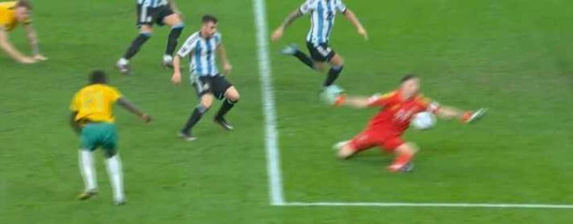 En la última jugada del partido, el marplatense salió a achicar en el área luego de que el balón le quede servido al australiano Garang Kuol. Dibu le puso el pecho, amortiguó el disparo que quedó boyando, se dio vuelta y la embolsó para que todo el pueblo argentino respire.